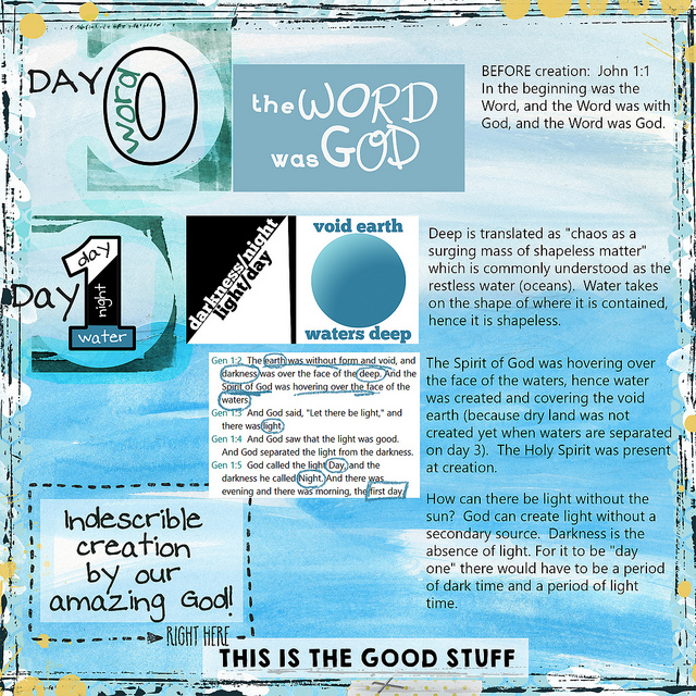 1:1-5 DAY ONE void earth, darkness/night, light/day, waters deep