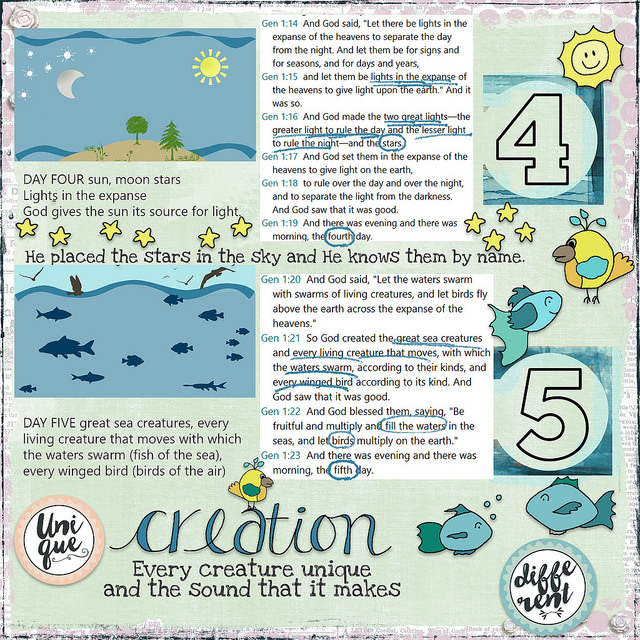 1:20-23 DAY FIVE great sea creatures, every living creature that moves with which the waters swarm (fish of the sea), every winged bird (birds of the air)
