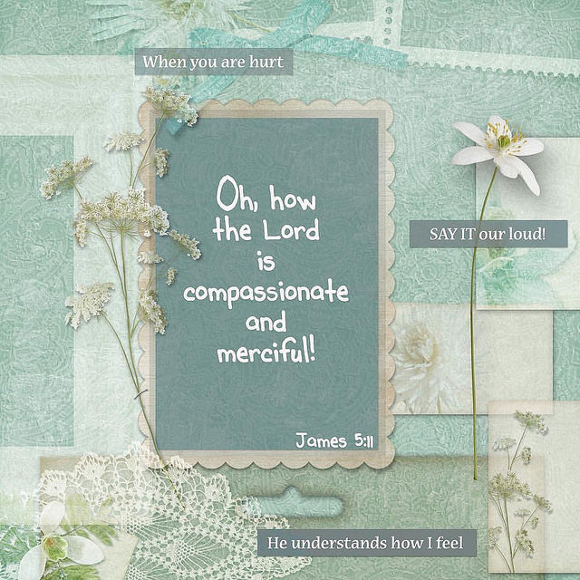 5:10-11 The prophets in the Old Testament are an example of suffering and patience and steadfastness. For a lesson on patience, read the whole Book of Job! The Lord hurts when we hurt. Say the words out loud from verse 11, over and over, when you are hurt, "Oh, how the Lord is compassionate and merciful!" God may not take away the hurt and suffering, but he does understand how I feel and is merciful (deserving of punishment not administered upon me). When hurting, I am blessed to receive strength and patience from the Lord, just like the prophets. I am to proclaim Christ regardless of what I go through. Yes, that is the hardest part, to declare Christ even in affliction. Our sinful self does not go there first.