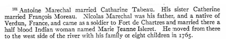 From: Garraghan's "Saint Ferdinand de Florissant, The Story of an Ancient Parish" p57-58, transcribed by Rick Peterson: "The Marechals, ranking with the Aubuchons as a distinctive Florissant Valley family, look back for the progenitor of the Missouri branch of the line to Nicholas Marechal, Sr., a native of Verdun in France. He had been a soldier in the French service and married his wife, Marie Jeanne Isleret, a half Illinoise nation native american, at Fort Chartres previous to 1753. Having come to St. Louis in 1765 with a family of eight children, five sons and three daughters, he received from Laclede a verbal concession of the northwest corner of Main and Chestnut streets, where he built a home, dying there in 1770. Before 1792, his son, Francois M. Marechal, husband to Marie Therese Riviere, was in Florissant, where six of their children were baptized in the parish church. Of these Francois Noel Marechal became the owner of a farm in the Common Fields which had been allotted to Pierre Devaux about 1785 and later became a part of the Seminary farm. Besides Francois, four other children of Nicholas Marechal, Sr., lived in Florissant, - Marie, married to Joseph Calve, Sr., Catherine, married to Joseph Francois Moreau, Marie Elizabeth, married to Jean Baptiste Primeau, and Antoine, married to Catherine Tebeau."