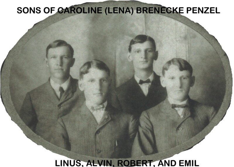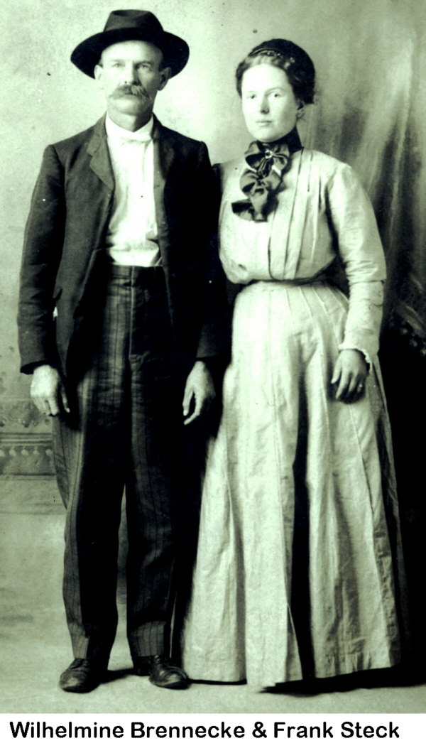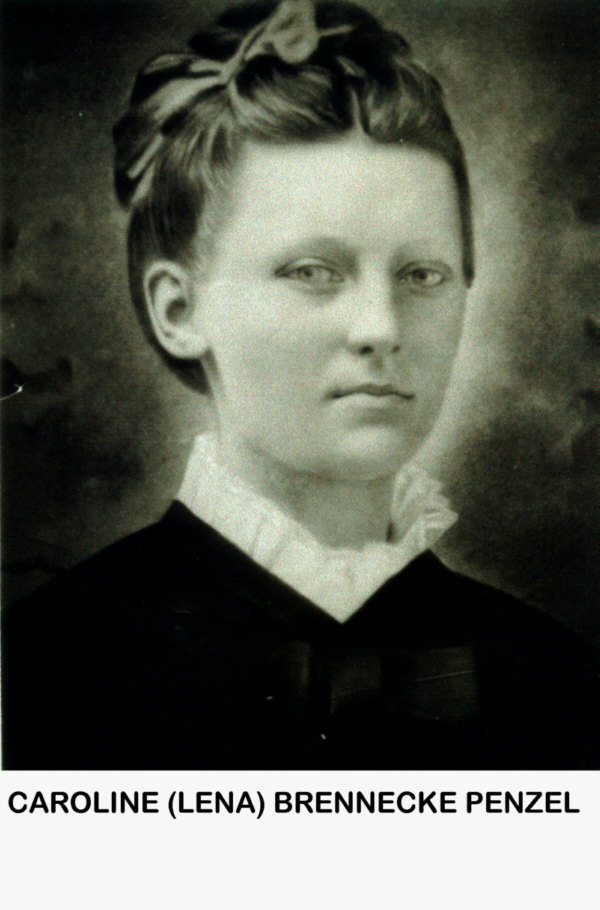 On Oct. 20, 1857 the widow Wilhelmine married Theobald Khreibil and they raised the two daughters of Henry Brennecke and Wilhelmine Altenthal Brennecke. Wilhelmine (Mina), the older daughter, married Frank Steck. Caroline (Lena) married Gustav Penzel.