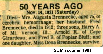 According to Alvin W. Brennecke, Fred worked for the old Potts Milling Company and Union Mills. Fred died on January 7, 1907 and is buried in Fairmont Cemetery in Cape Girardeau, northeast of Broadway and North Clark streets. His tombstone mistakenly shows April 14 as his birthday. After coming to America, such detailed information as birth dates were often forgotten, plus many people could not read or write.