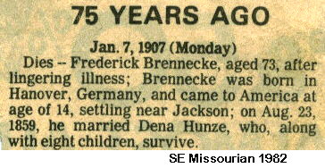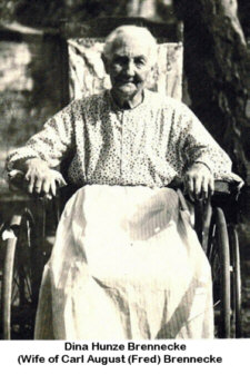 At age 11, he and his family arrived in America on November 11, 1844. Fred evidently moved from the family farm (near Jackson) to Cape Girardeau at an early age. Frederick Brennecke and Dina Hunze were married on August 23, 1859 at the Methodist Episcopal Church in Cape Girardeau by Pastor H. Schultz (Book C, page 147 of marriage Records in Cape Girardeau County, MO.).