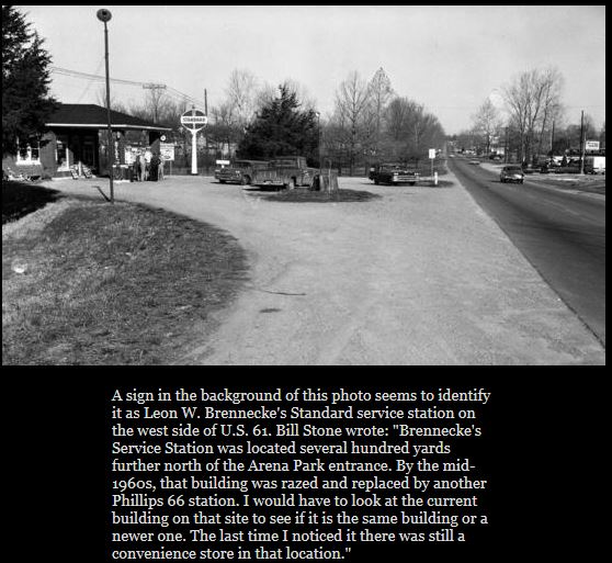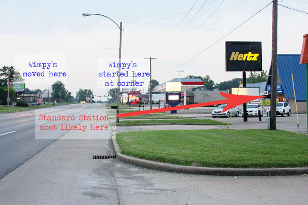 I need to do some research to find the exact location of his gas station, but here is my best guess based on the old photo. I believe it sat where the a-frame blue roofed insurance agency now sits on North Kingshighway. It may have been where the current gas station is or the rental place next to it, but whereever it was, it was only a short distance down the street from Wimpy's.