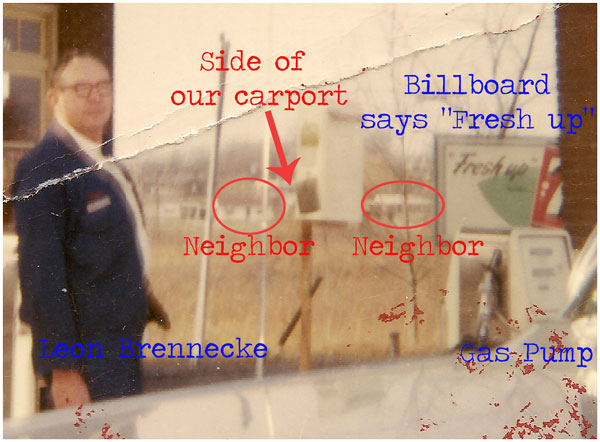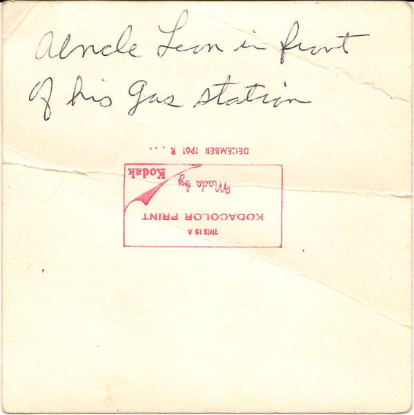 Our home was built around 1960 and this photo was taken in December 1961. This clue also tells me that Leon, at the age of 57, was still running his gas station.