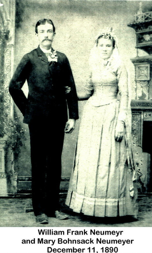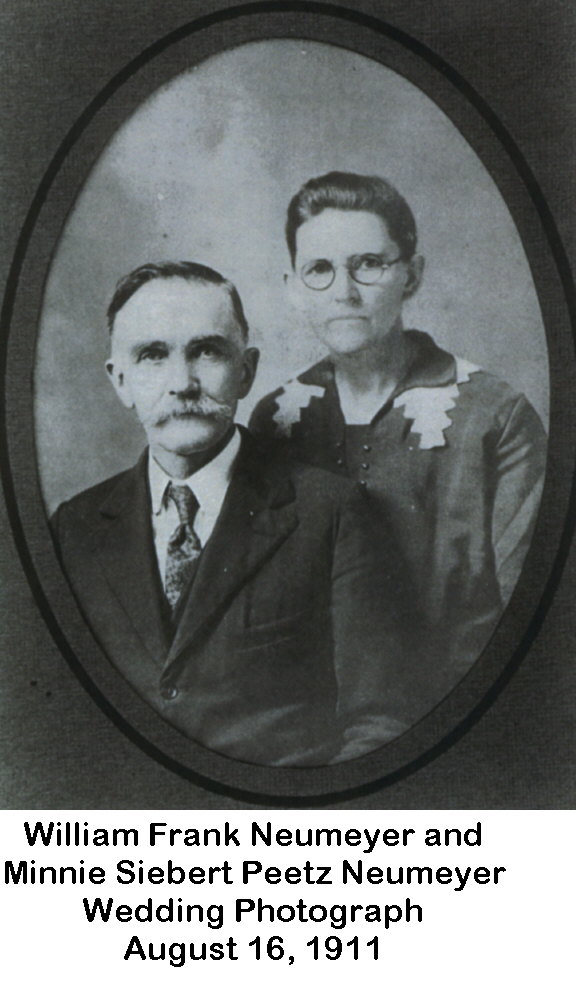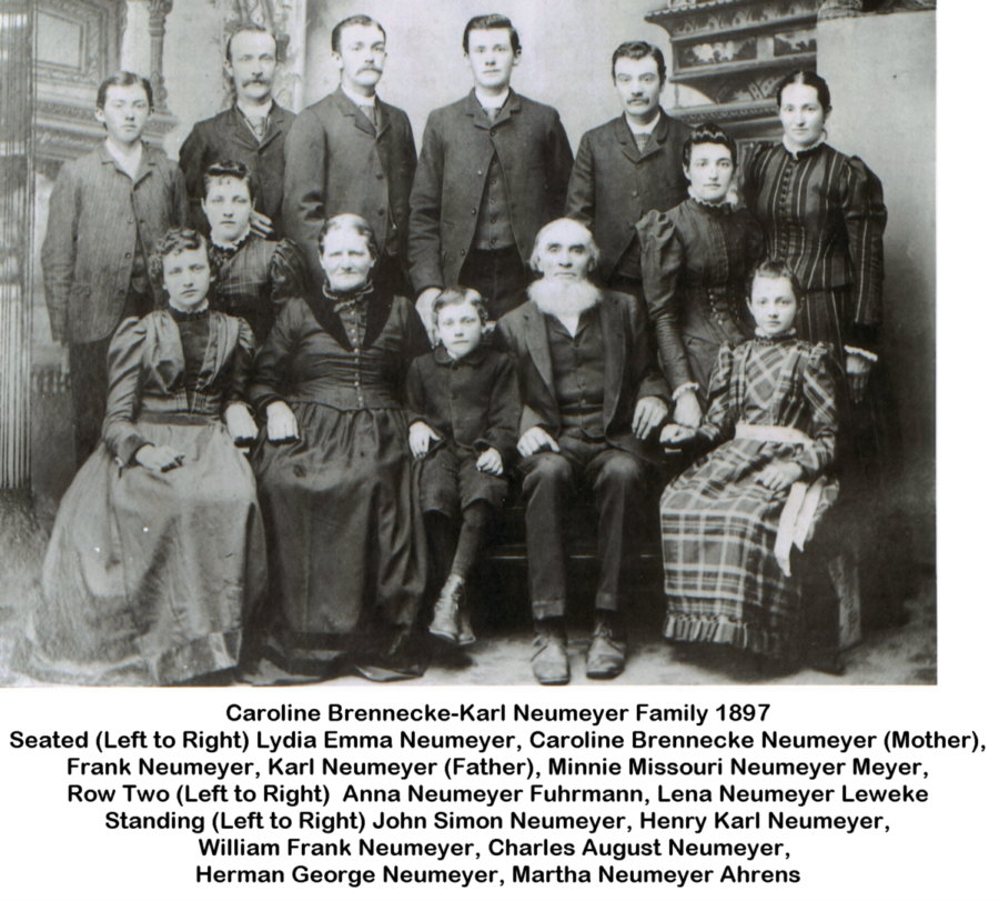 Caroline Brennecke was born in the Sebexen area of Germany (her birth records have not been found) on July 16, 1841. Her family came to America when she was about three years of age and they located on a farm west of Gordonville. It seems that there were many German families who settled in that vicinity. Caroline's brothers were Frederick, August, Heinrich, William, Charles, George, Frank, and Jake, and one sister, Louise. Caroline and Karl Neumeyer were married shortly after he returned from a California venture, on April 14, 1861 in the Gordonville Church.