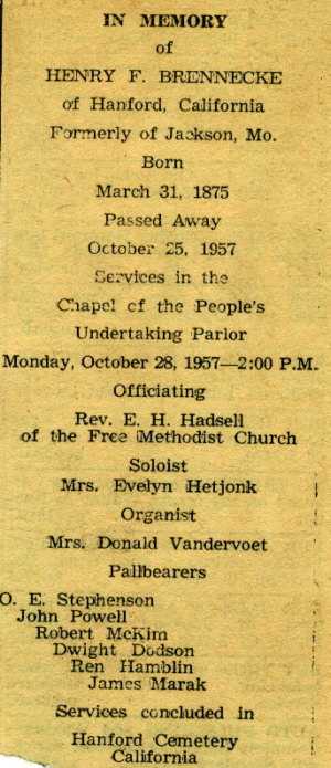 George H. Brennecke was born July 10, 1845, the first of the Brennecke children born in the United States. In the Jackson, MO Probate Court records concerning the estate of August Brennecke, one of the children listed was SCHOOSE/SCHOISE. Henry Sander of Cape Girardeau said that that was the German pronunciation for George.