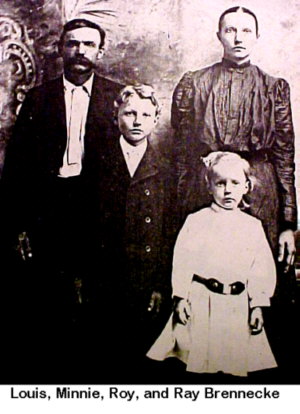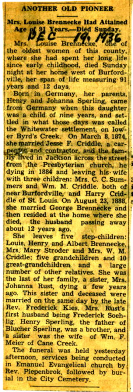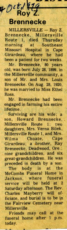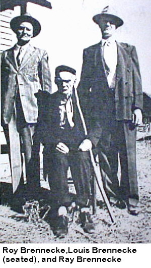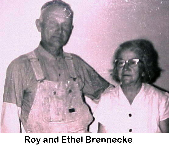 The George Brennecke farm was on Stroder Branch, on State Highway UU. A great grandson, Carl Criddle, owns the farm now. He lives on the right side of the road, 1 1/2 miles on St. Highway UU, from Highway 34. His mother still lives on the (Criddle) home place across the road on the left. A few yards down the hill on the left is where the original George Brennecke home stood. There is a metal building where the cellar was located. On down the hill on the left is a row of trees where the three story basement type barn was. They could drive their wagons right into the third story (40 x 40) loft, then unhook the horses and take them outside or to the basement stalls. The only entrance to the basement was on the other side of the barn near the branch. The basement portion of the barn was 20 x 40, as was the second floor. The second floor had a hallway that you could drive on thru. When the new road was built the road and Stroder Branch were rerouted close in proximity to where the barn stood. The 1988 Brennecke Family book states the hewed stones of the basement type barn mark the site of the Brennecke homestead. Some of those stones were moved to the right of where the barn was standing by Carl Criddle, and some of them were covered up, so the trees on the hill mark the spot of the barn.