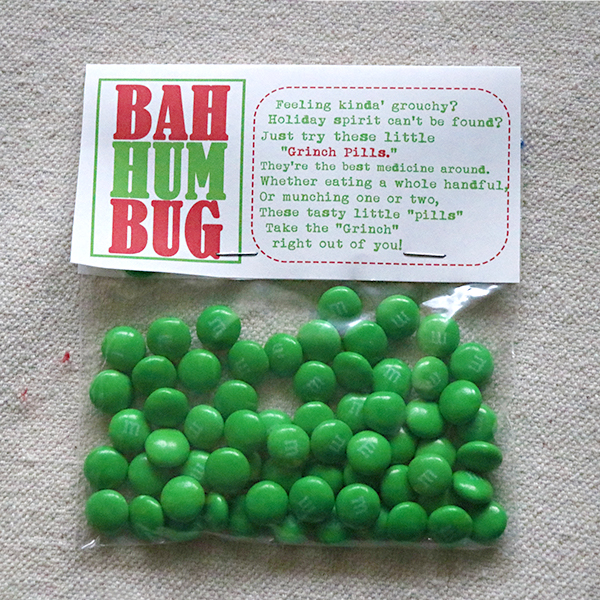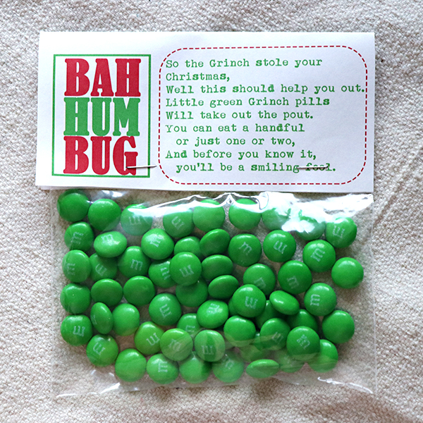 I used 5 inch square snack baggies, but I made the bag topper in two sizes, the second for standard sandwich bags because they are commonly found. I printed on regular paper and stapled it to the bag to keep the project simple. Cardstock or other papers of your choice could be used. I bought Christmas M & M's and separated the green from the red because the Grinch himself is green. After I printed, I cut the paper in half (there are two prints per piece of paper) and then folded the design in half before cutting so that the edges would be even. Because I used regular paper, I could see through the paper to line up the edges of the design.