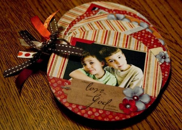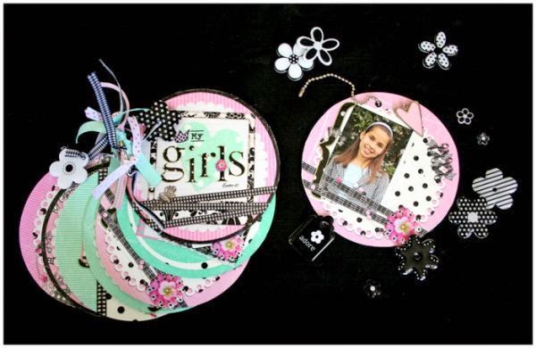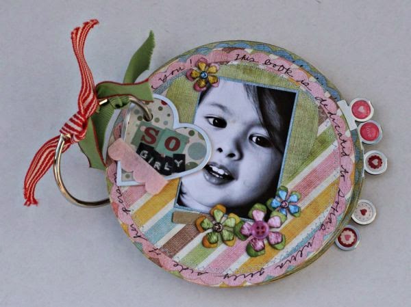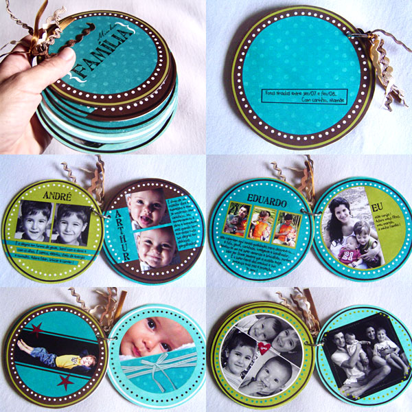This is from her blog post: "Then I scrapped the pages, printed them on 5 x 7 photos at Walmart, cut and pasted them onto old CDs. Then I threaded them all onto a loose leaf ring and added some ribbon! And voila!: