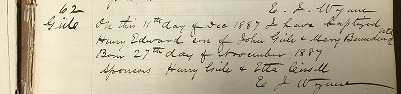 Baptism record of Henry Edward Geile at Silver Lake, on December 11, 1887.