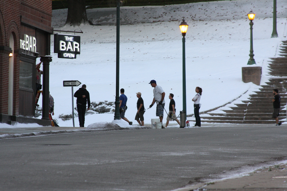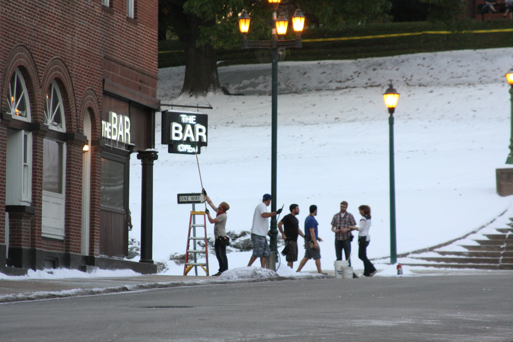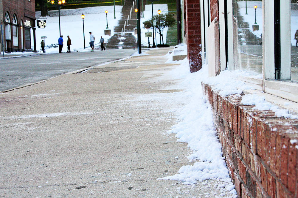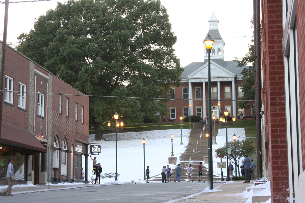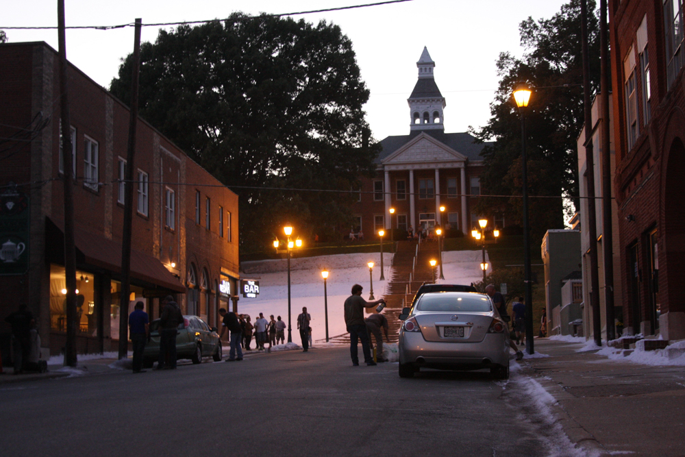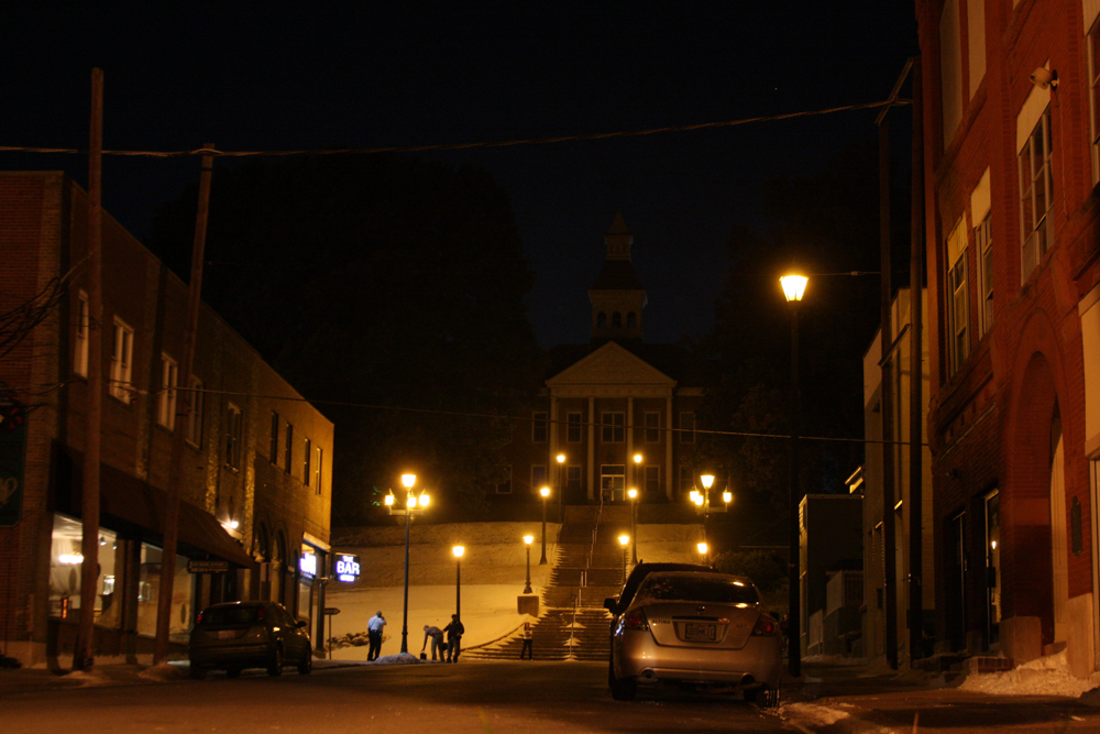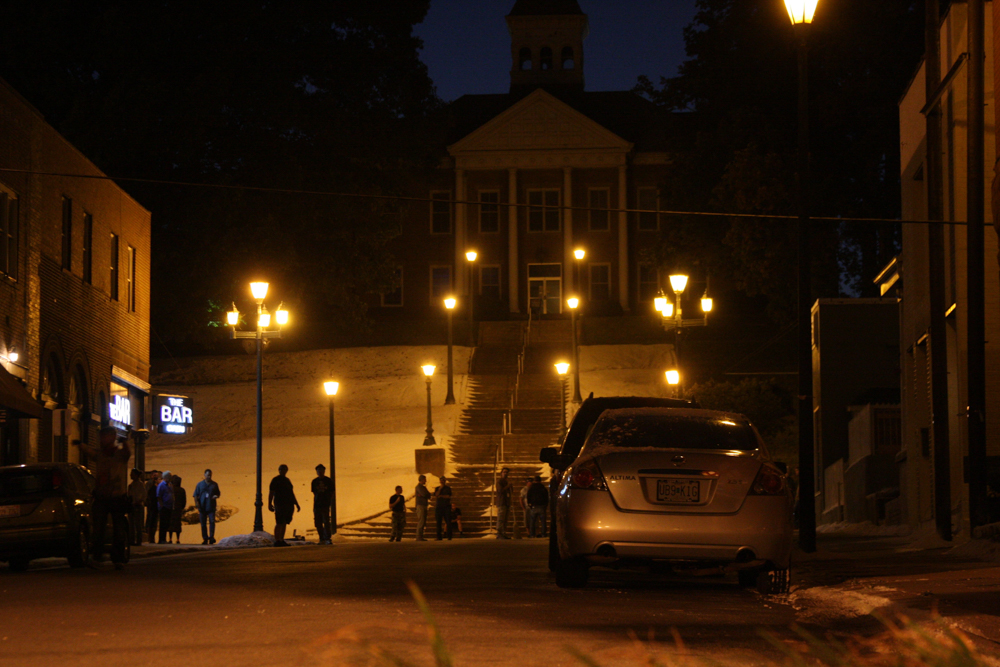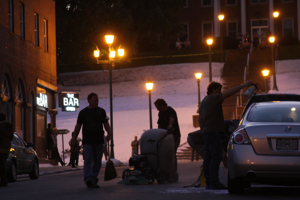 For the filming of the movie Gone Girl (I was an extra weeks earlier) on October 11, 2013, the production put fake snow on the grounds of the Common Pleas Courthouse, although no snow had fallen anywhere else in Cape Girardeau. We were not allowed to get too close, so I took photos from down the block. Right before filming began, they put up barriers so we could not see and the crowd dispersed. In the slideshow above, you can see them putting the final details of snow about the scene, from spraying the streets, the ledges on the outside of The Bar, and the cars. As it got darker into the evening, I played with longer exposure to make the lights twinkle. Some of the images are not as good, but I think they have value of their own. I put some of the photos from the above slideshow at the bottom of this page.