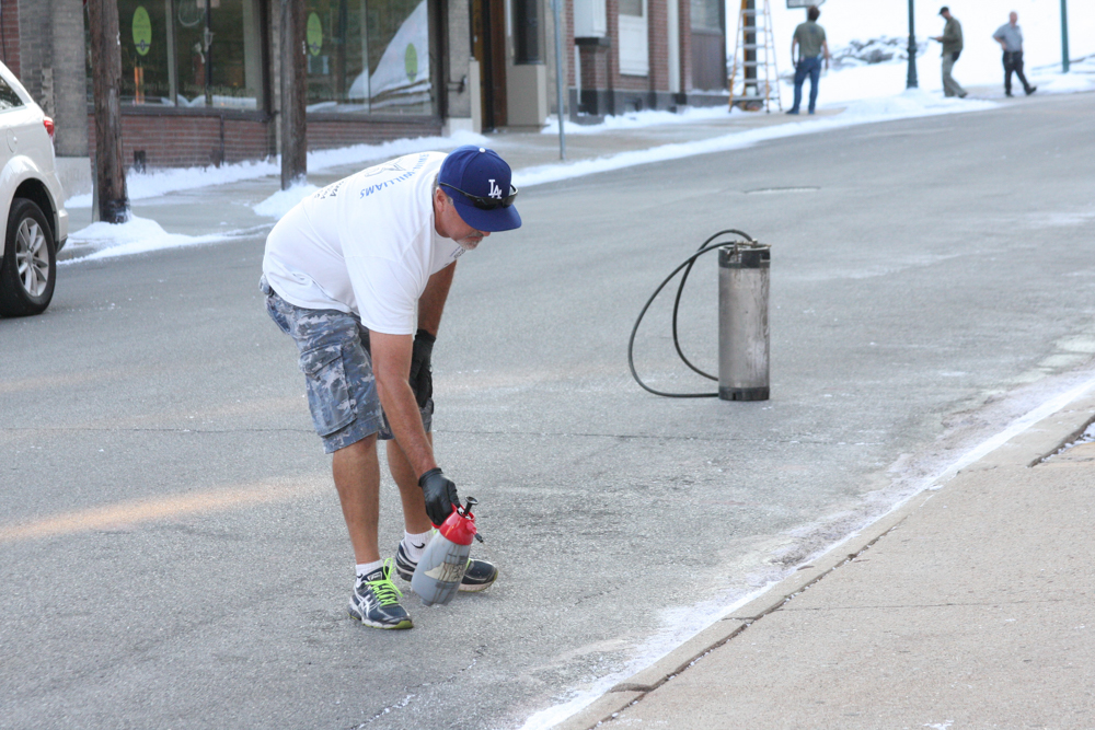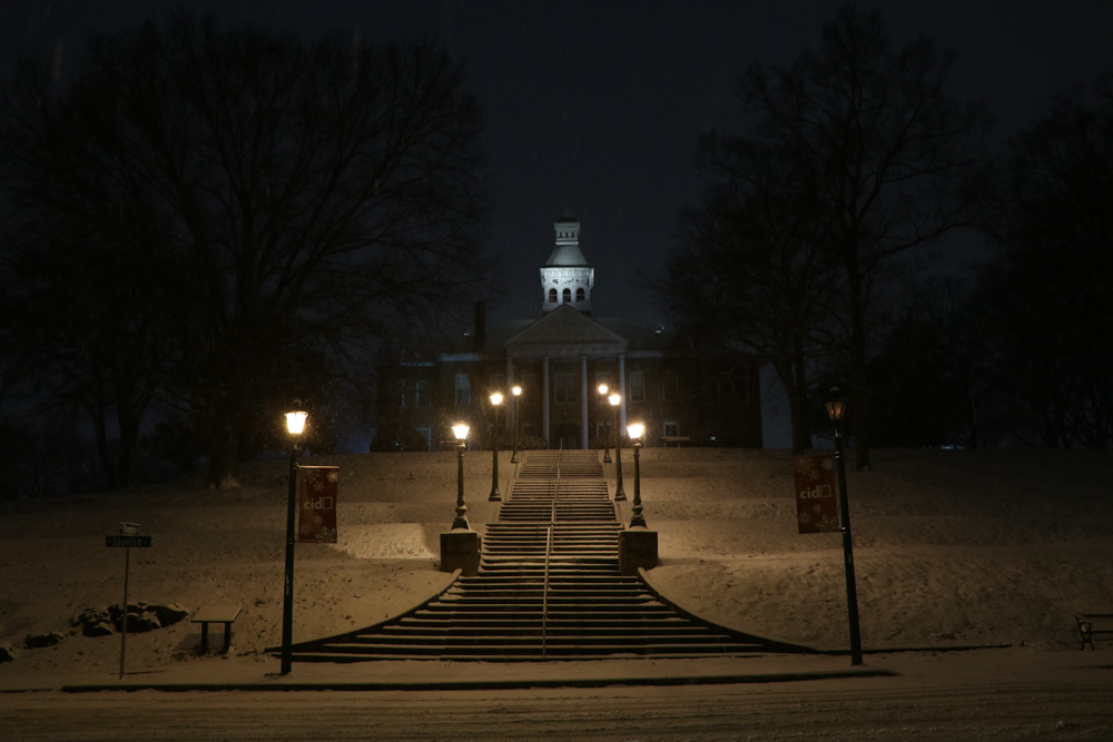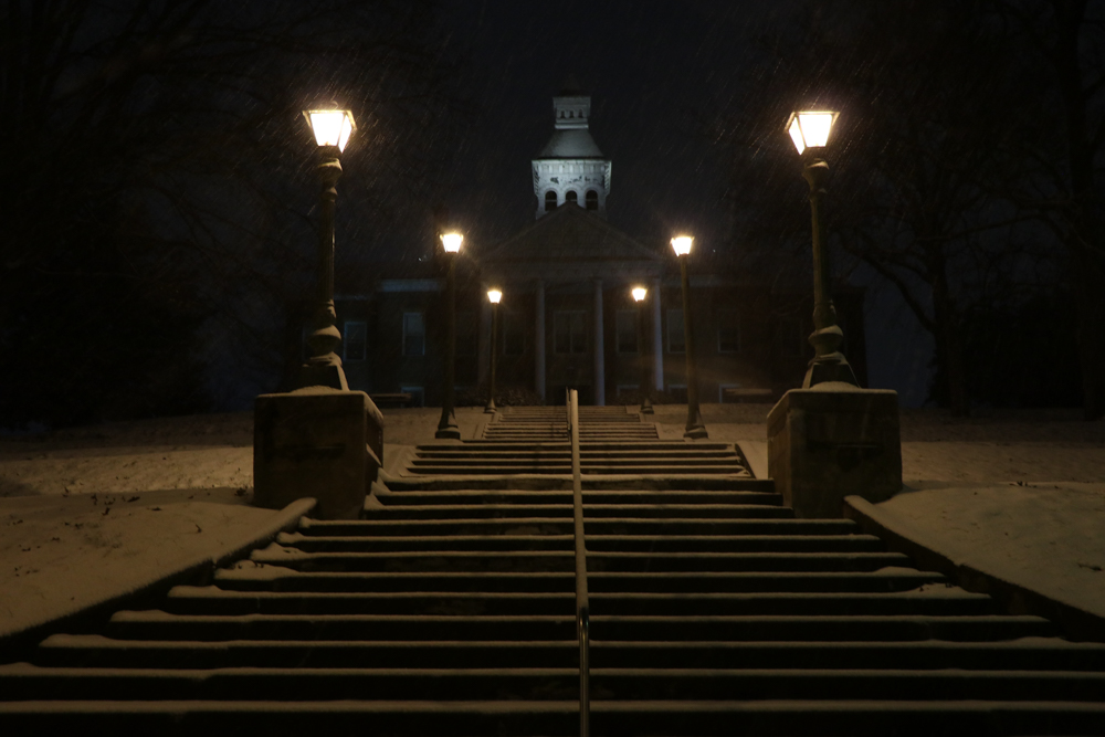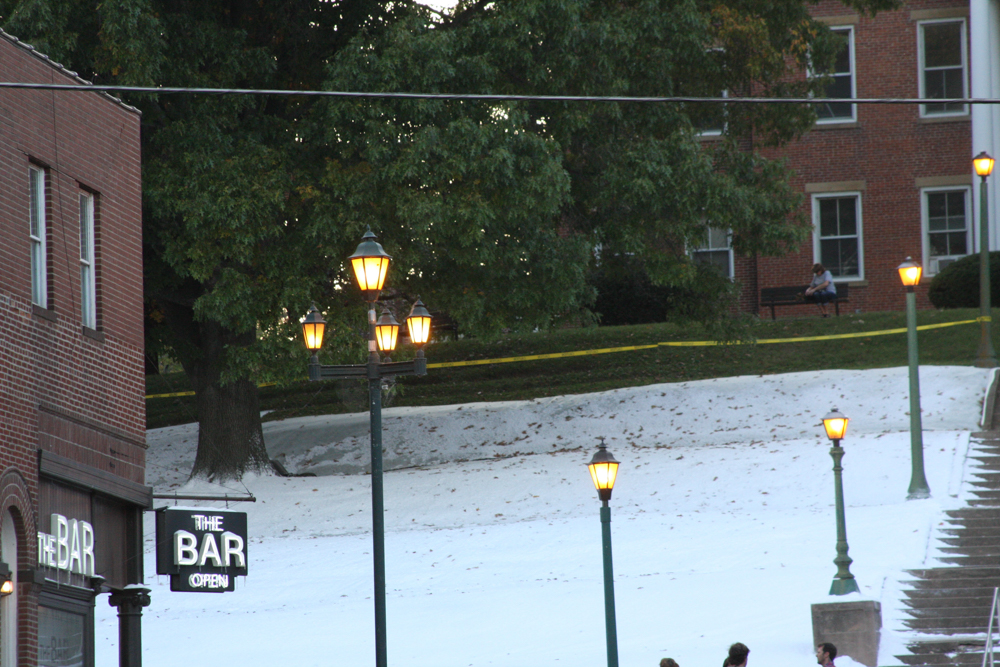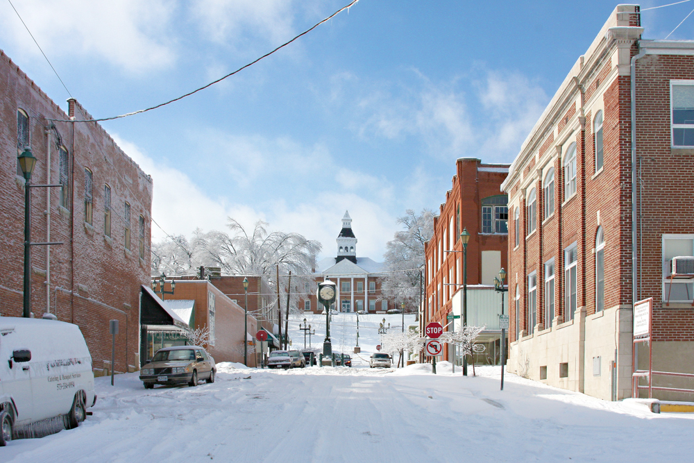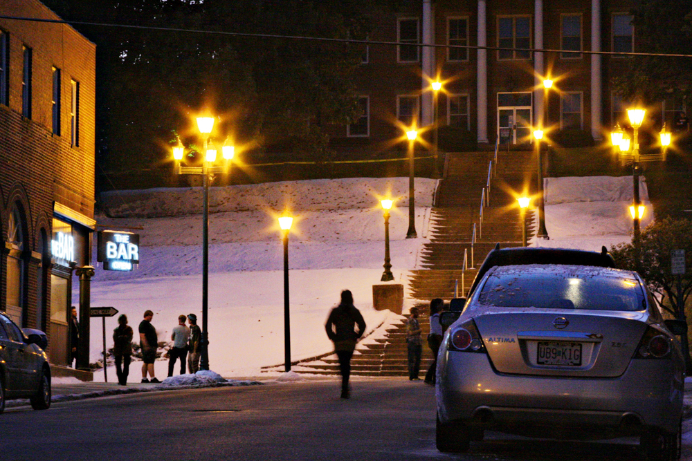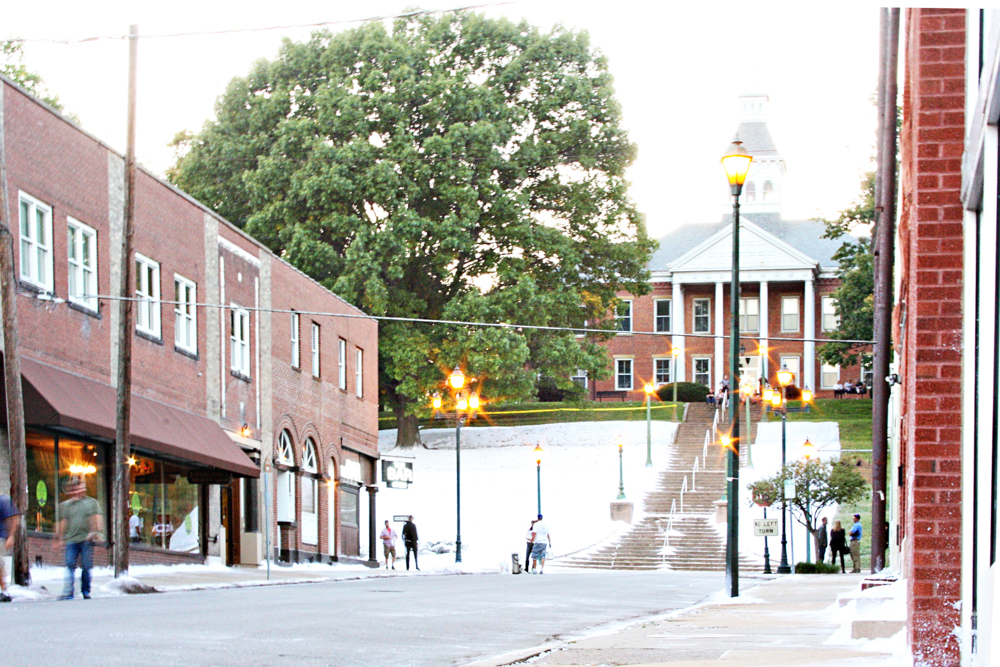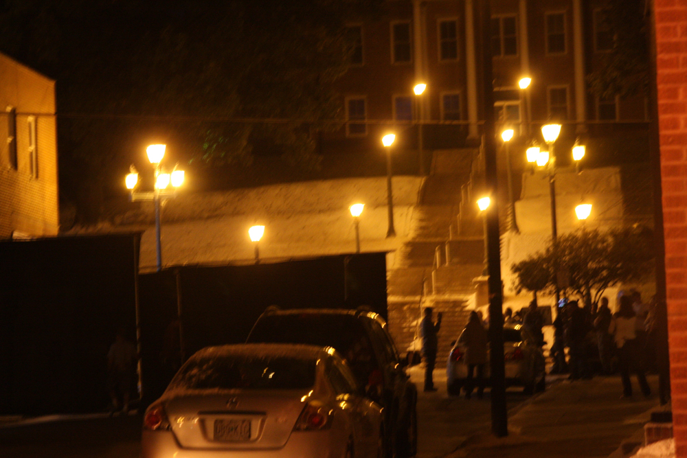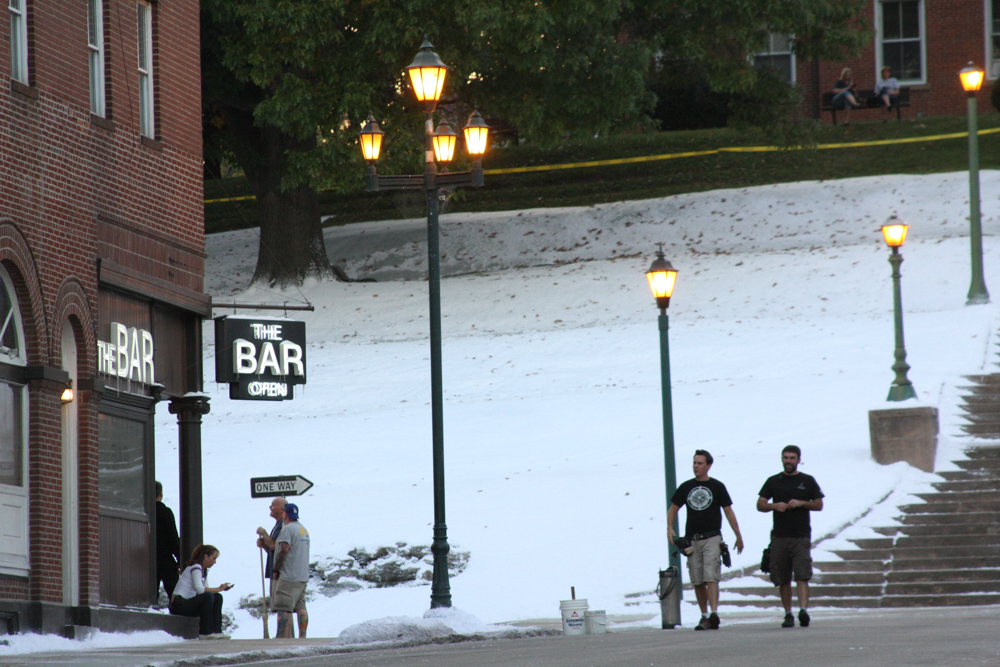 For the filming of the movie Gone Girl (I was an extra weeks earlier) on October 11, 2013, the production put fake snow on the grounds of the Common Pleas Courthouse, although no snow had fallen anywhere else in Cape Girardeau. We were not allowed to get too close, so I took photos from down the block. Right before filming began, they put up barriers so we could not see and the crowd dispersed. In the slideshow above, you can see them putting the final details of snow about the scene, from spraying the streets, the ledges on the outside of The Bar, and the cars. As it got darker into the evening, I played with longer exposure to make the lights twinkle. Some of the images are not as good, but I think they have value of their own. I put some of the photos from the above slideshow at the bottom of this page.