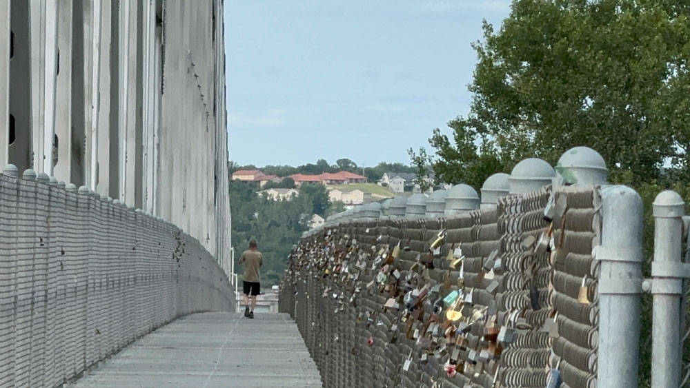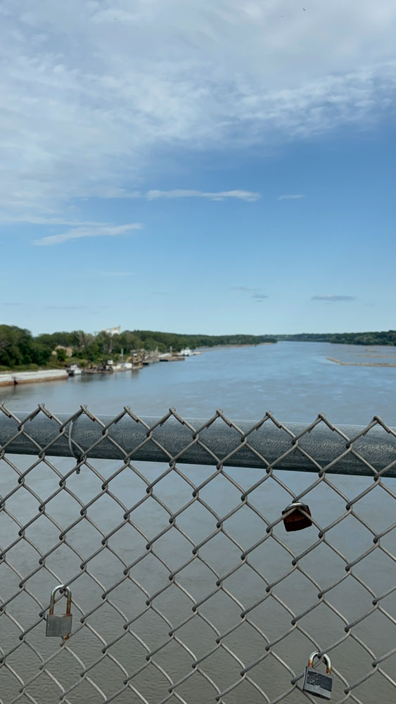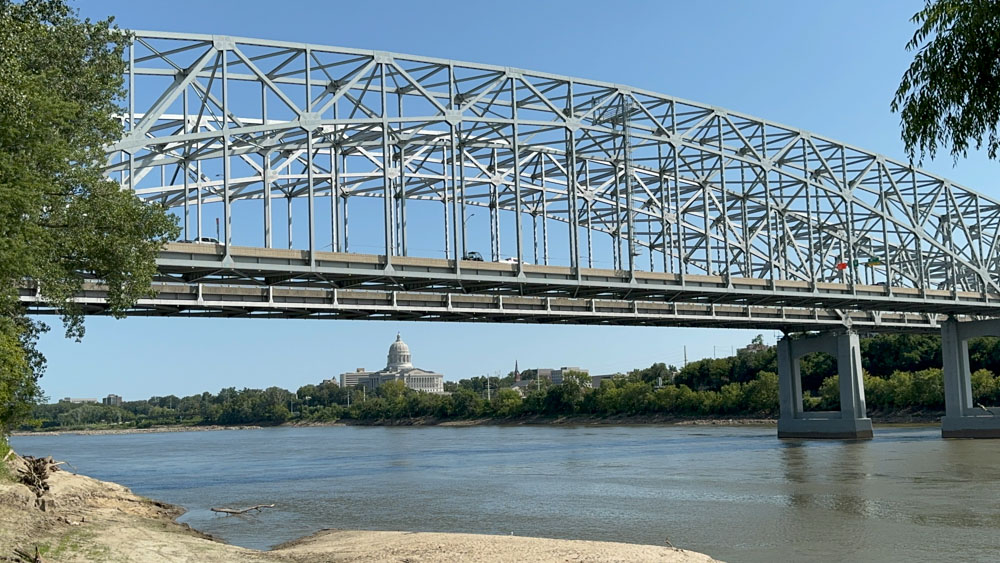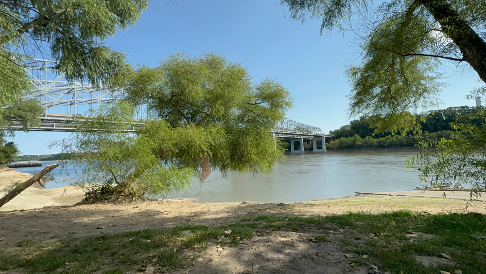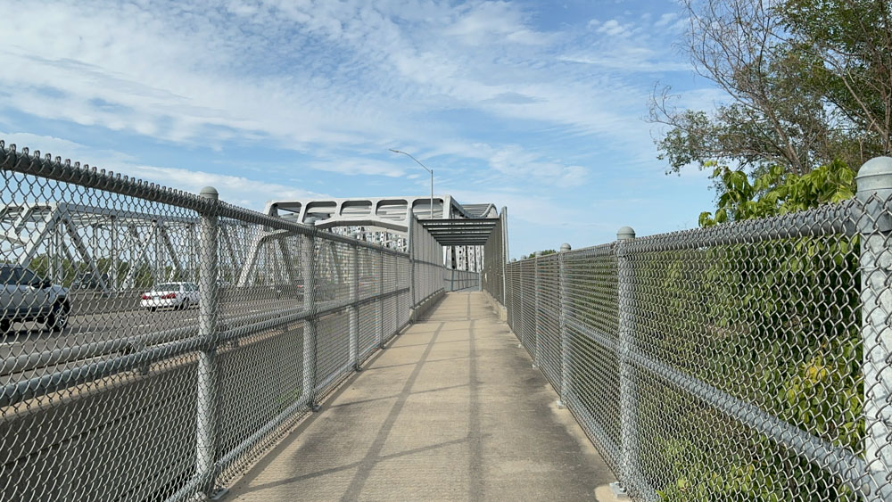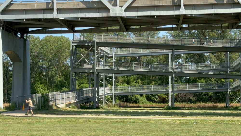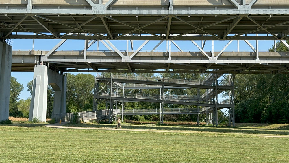 There is a square spiral concrete walking and biking way which takes you upward and downward to the Highway 63/54 that goes over the Missouri River. There is a trail that is used by the Katy Trail system to go across the river. The trail runs next to the major highway and the bridge shakes!