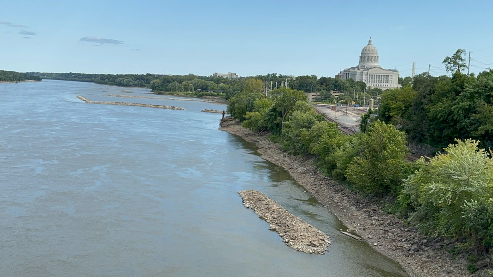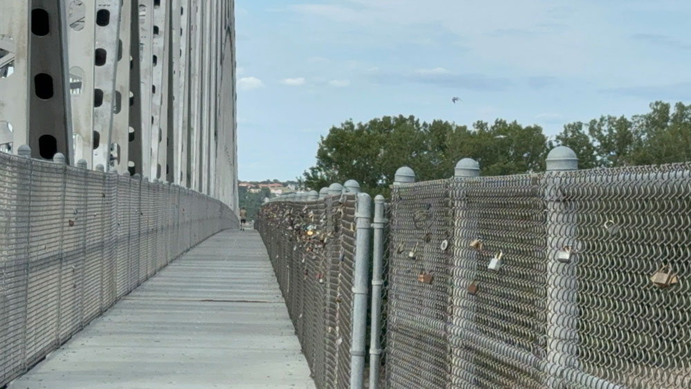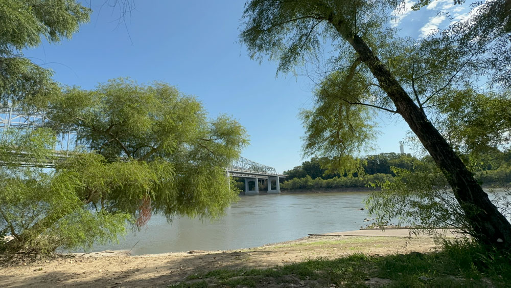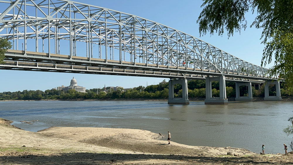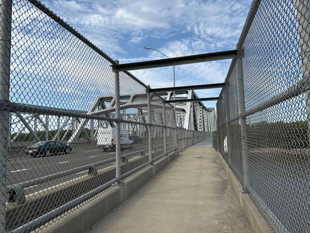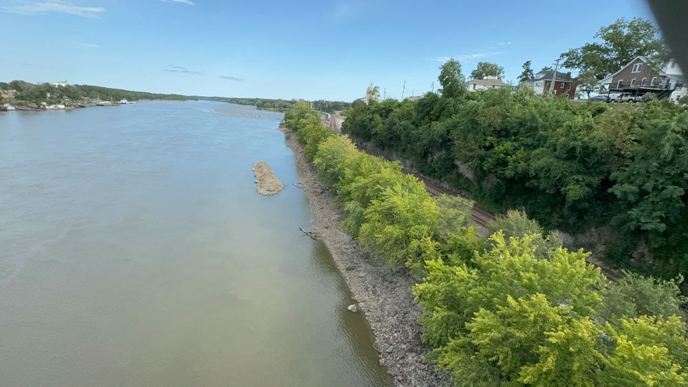 There is a square spiral concrete walking and biking way which takes you upward and downward to the Highway 63/54 that goes over the Missouri River. There is a trail that is used by the Katy Trail system to go across the river. The trail runs next to the major highway and the bridge shakes!