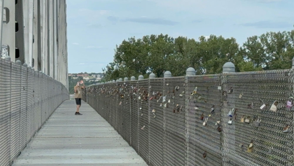 Here is me filming him filming me! There are a lot of "love locks" on the fence. Love locks are padlocks that couples attach to bridges as a symbol of their love. The Brooklyn bridge is well known for this activity.
