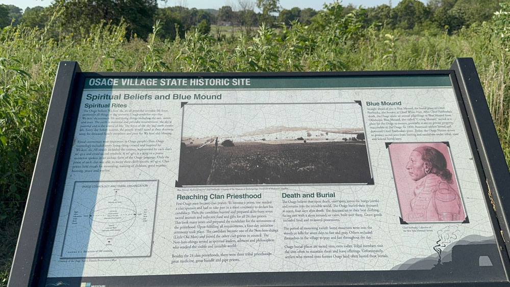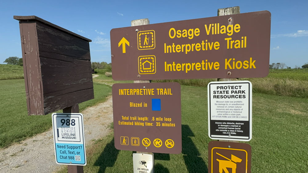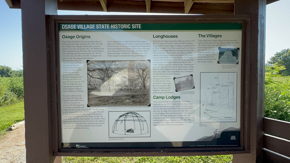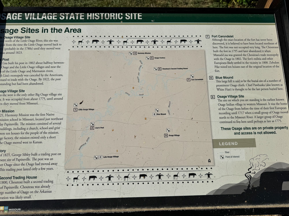 Osage Village State Historic Site is in Vernon County, Missouri. As we are trying to visit something in every county of Missouri, this was it in this mostly rural county. Until we read the signs along the trail, I did not realize this side of Missouri was so heavily populated with the Osage Native Americans. We visited on August 8, 2025.