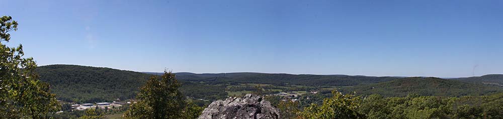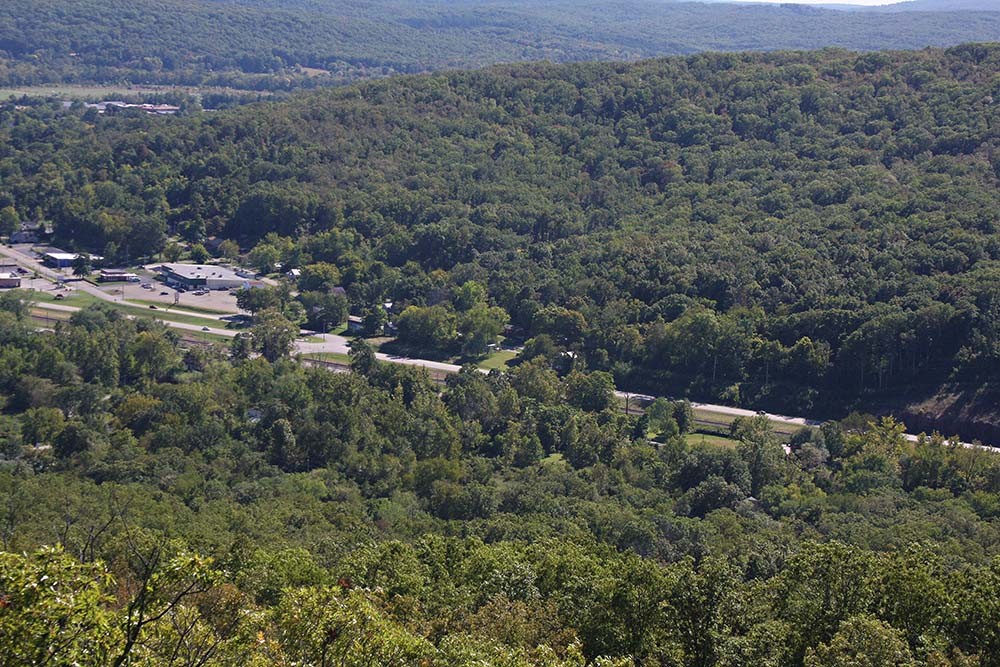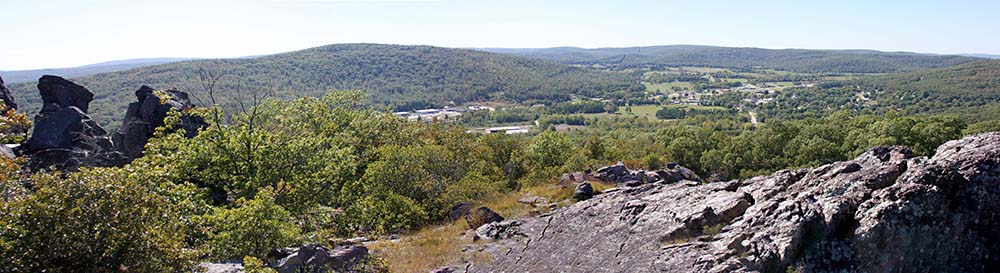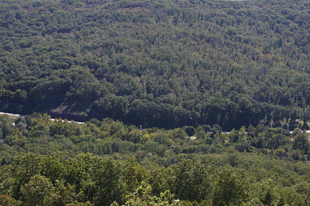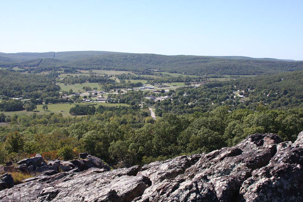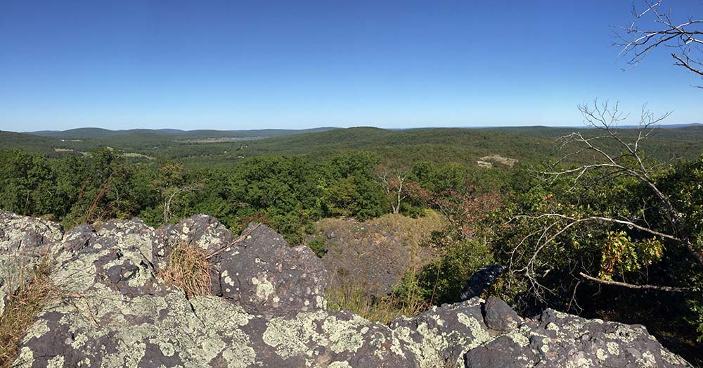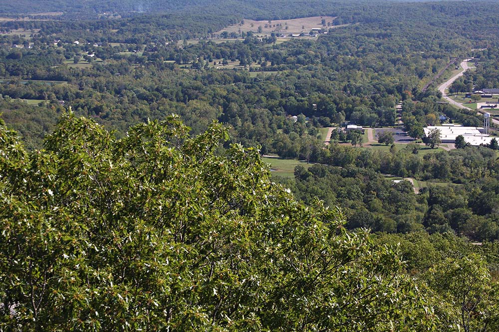 This is a photo from below the mountain from Fort Davidson. You can see the top of the mountain where one stands on the rocks.