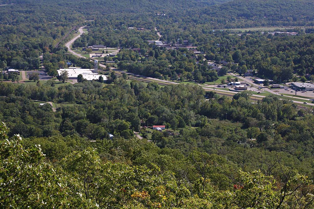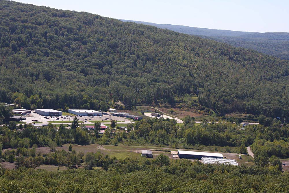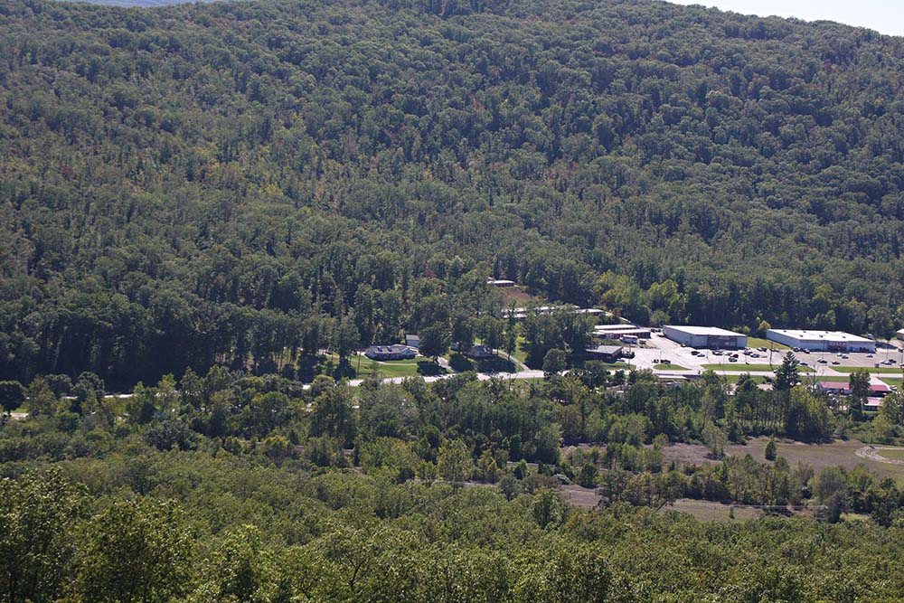 This image is taken from the top of Pilot Mountain and marks where the Fort Davidson, the conservation building, and Granny's house are located.