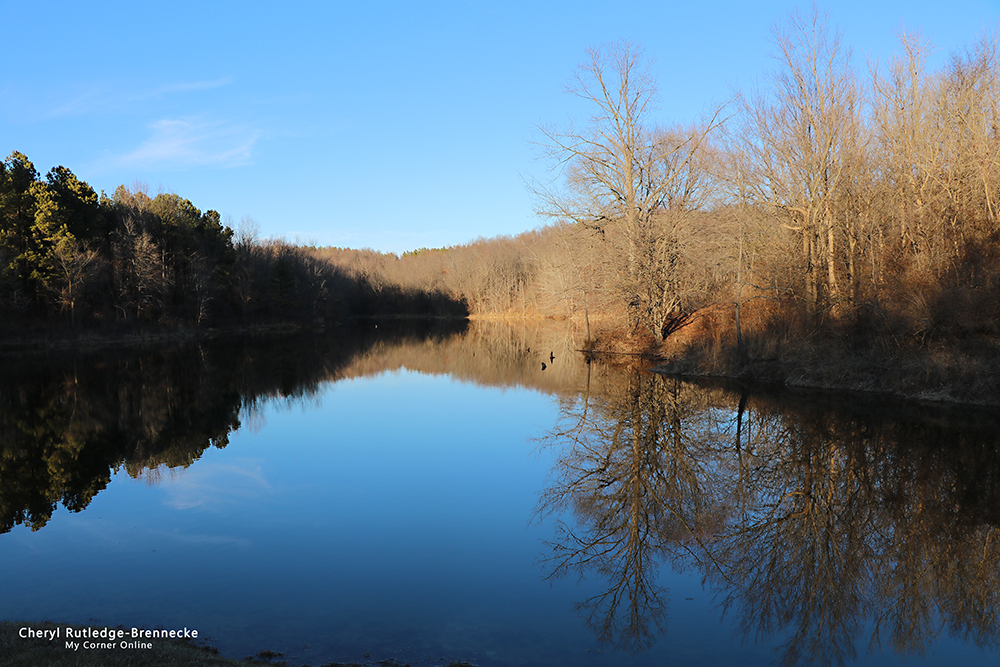 The pine trees embraced by the blue sky and complimented with the yellow of deadness made me realize how beautiful Winter can be if you just take a moment to get outside. I was surprised at the green underfoot as it is too early for grass to be greening up. I loved the reflection of the trees in the water.