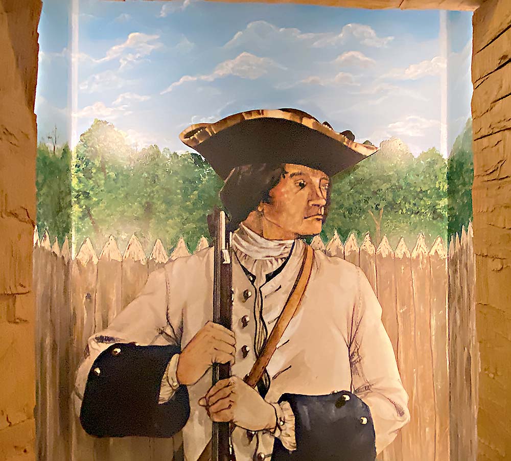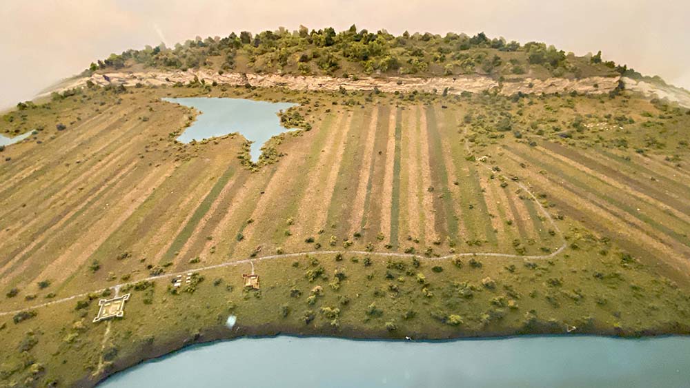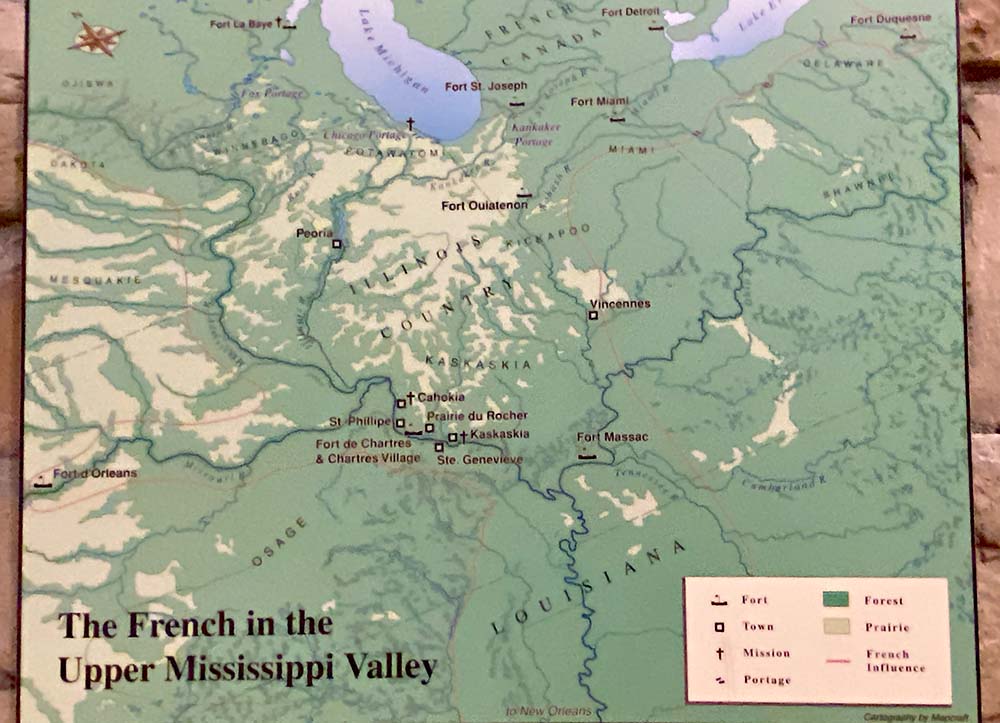 I like this diaroma because it shows the fort in the bottom left against the size of the river. Aross the fields ("American Bottoms" or "Mississippi River bottomland") you see the bluff. The bluff was important in the history. Be sure to take the historic drive along the bluffs. The third fort was built with limestone from these bluffs. On the right is Prairie Du Rocher (which translates to "prairie by the rock."), so there is more perspective.