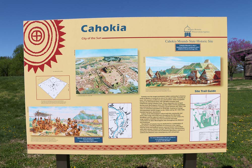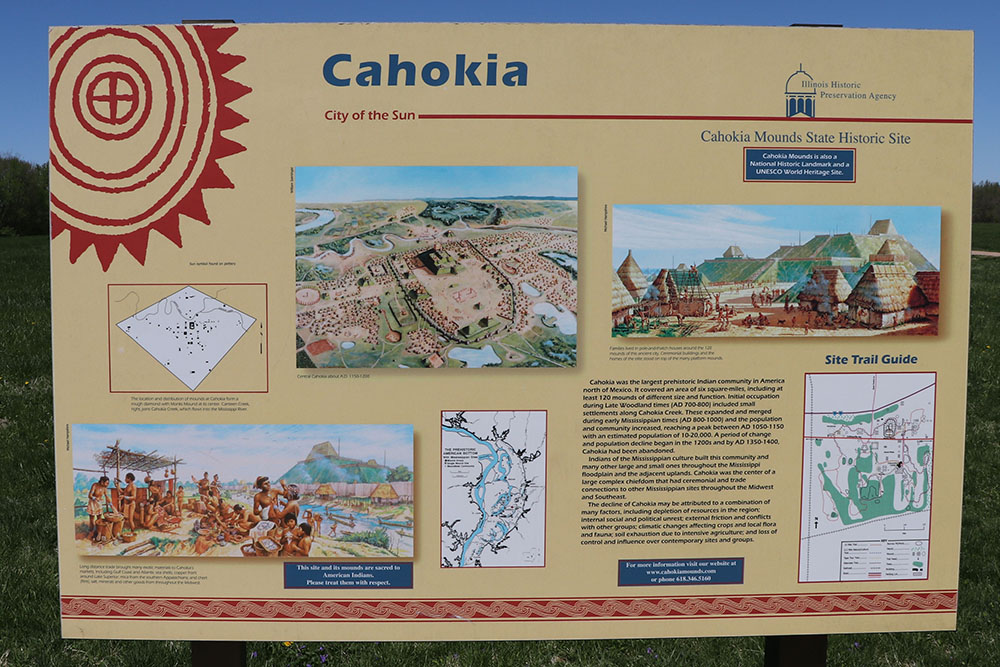 This sign says that Cahokia was the largest prehistoric Indian community in America north of Mexico. It covered an area of six square miles, including at least 120 mounts of different size and function. Initial occupation during Late Woodland times (AD 700-800) included small settlements along Cahokia Creek. These expanded and merged during Mississippian times (AD 800-1000) and the population and community increased, reaching a peak between AD 1050-1150 with an estimated population of 10,000-20,000. A period of change and population decline began in the 1200s and by AD 1350-1400, Cahokia had been abandoned. Indians of the Mississippian culture built this community and many other large and small ones throughout the Mississippi floodplain and the adjacent uplands. Cahokia was the center of a large complex chiefdom that had ceremonial and trade connections to other Mississippian sites throughout the Midwest and Southeast. The decline of Cahokia may be attributed to a combination of many factors, including depletion of resources in the region; internal social and political unrest; external friction and conflicts with other groups; climatic changes affecting crops and local flora and fauna; soil exhaustion due to intensive agriculture; and loss of control and influence over contemporary sites and groups.