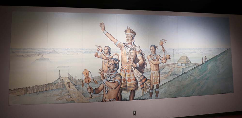 The paramount chief and his attendants greet the rising sun from the top of Monks Mound. Among some later Mississippian peoples in the Southeast the chief was believed to be related to teh Sun and that may have been true at Cahokia as well.
