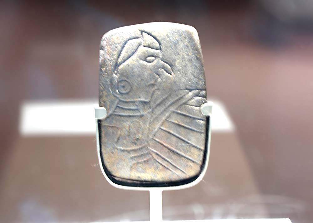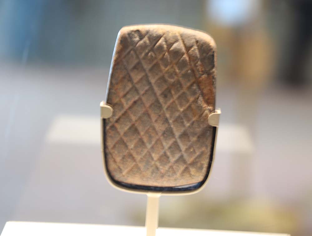 This is a blurry photo, but in the museum there are a lot of pottery artifacts. I like the swirl on this one with the lines.