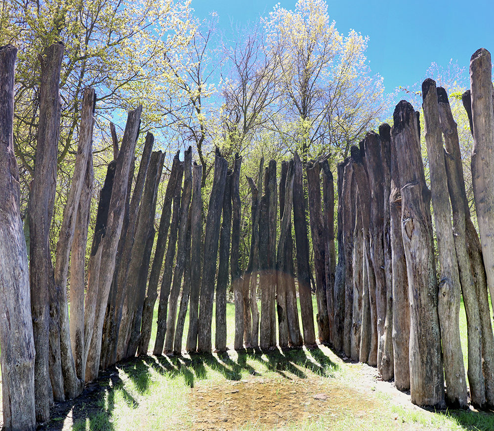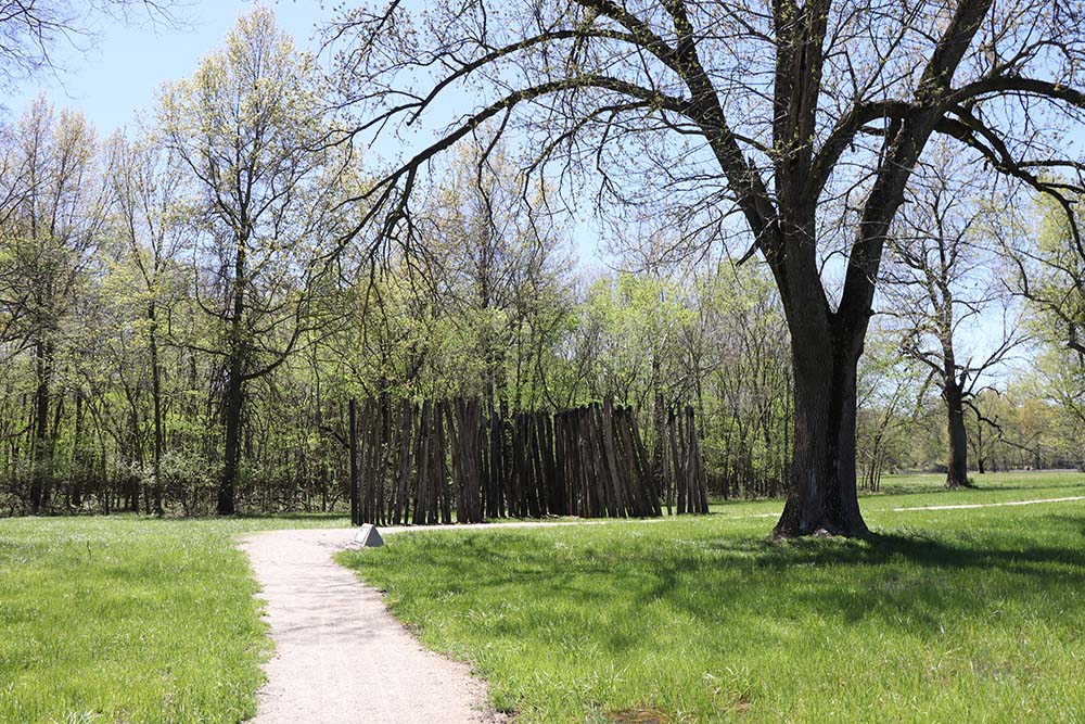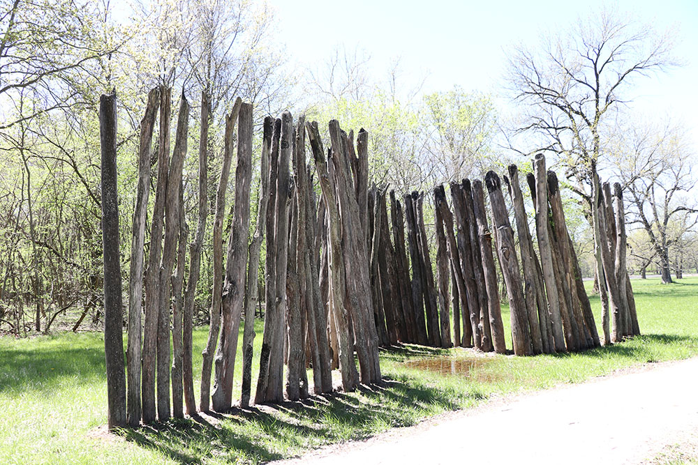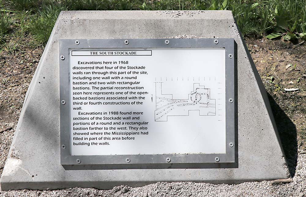 This sign says: The central ceremonial precinct of Cahokia was enclosed by a defensive wall, the Stockade (or Palisade). It was built of upright logs placed in 4-5 foot deep trenches and probably stood 10-15 feet high above the ground. It would take an estimated 15,000 - 20,000 logs to build this wall that was nearly two miles long. At regular intervals (about 85 feet, center-to-center) were bastions, guard towers with raised platforms for warriors to protect the front of the wall. L-shaped entryways were occasionally placed between bastions. The Stockade would also serve a social function. The wall enclosed an area of nearly 200 acres, including Monks Mound and 17 other mounds. Those living inside the sacred precinct were somehow different from those living outside, possibly related to the ruling elite. However, it is likely that all citizens would be allowed inside for festivals and ceremonies, or to help defend, if needed. It is not know if the enemy were local or from distant areas, or if the site was ever attacked. The wood does not survive, but archaeologists can see dark linear stains in the soil marking where the trenches had been dug into the lighter subsoils. Four constructions of wall are evident, often overlapping each other, with the size and shape of the bastions changing each time.