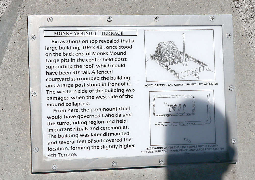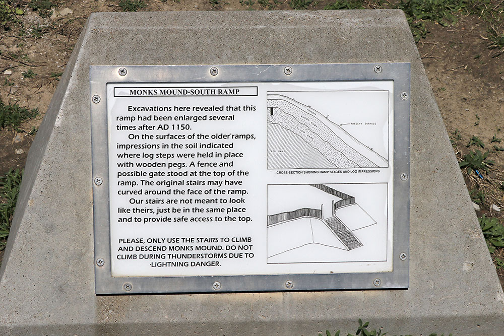This sign says: Monks Mound is the largest prehistoric earthwork in the Americas. Its base covers over 14 acres, and it rises to a height of 100 feet. It contains an estimated 22 million cubit feet of earth, all hand-carried in baskets from the many borrow pits throughout Cahokia site. It was not built all at once, but in a series of stages, mostly from AD 950-1200. Core-dillings through the mound suggest eight to 14 building stages. Excavations at various locations found indications of a stairway on the South Ramp; several buildings and a small mound rebuilt eight times on the First Terrace; a large temple structure on the Fourth Terrace; evidence of a French chapel and historic Indian occupation (1730s) on the First Terrace; and the discovery of the Birdman Tablet on the east side of the mound. Recent tests confirm that the First Terrace was a late addition to the front of the mound and drilling deep beneath the Second Terrace encountered a large mass of stone cobbles whose function is unknown at this time. The Mississippians were also doing soil engineering, selecting and placing specific soils for strength or drainage. It is called Monks Mound because a group of French Trappist Monks lived on a nearby mound from 1809-1813 and planted gardens, fruit trees, and wheat on the terraces of this mound.