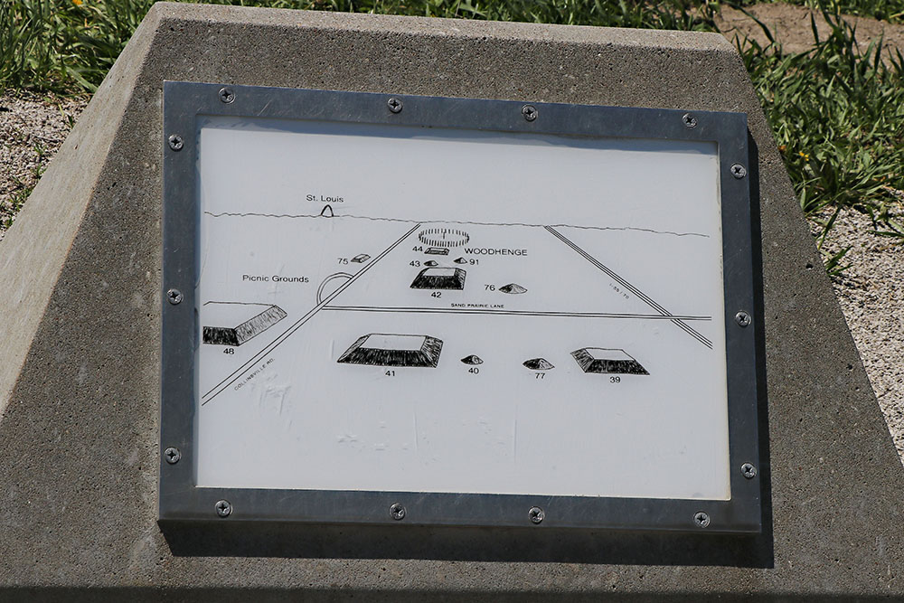 The sign says "The Birdman Tablet was found in the Monks Mound area and dates to A.D. 1300. The front of the sandstone tablet is a man with a bird-like mask and winged costume in a dance pose, common bird-man symbolism of Mississippian culture. This striking image has been adopted as the Cahokia Mounds logo."