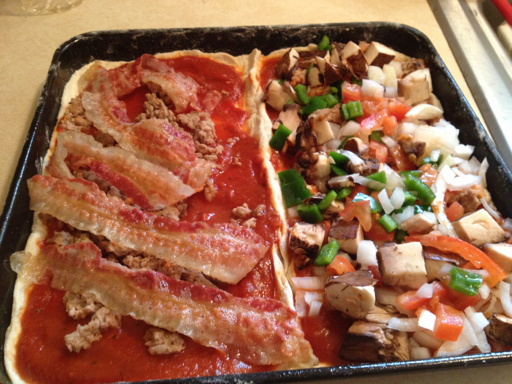 We scrunched up the middle of the dough to keep our sides separated. We added canned pizza sauce and ground turkey (he got about 3/4ths of the turkey).