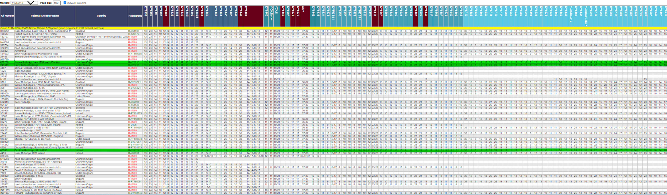 Click to open a larger copy of the above image. This chart is from the Rutledge Y-DNA project at Family Tree DNA. There is one known and verified man with Y-DNA connected to Edward Rutledge, the signer of the Declaration of Independence from South Carolina. His brother, John Rutledge, was part of the Philidelphia Convention that wrote the Constitution of the United States of America. Either one of them, or their father or grandfather, are likely to be my ancestor per Y-DNA. Note how many DNA markers are exactly alike. The top bright green line is "my" Y DNA. Next below him is Dave the 'zero-distance" match mentioned above. The third bright green line is the known signer decendant's DNA.